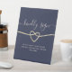 Élégant, simple, minimaliste, panneau de table de mariage bleu marine avec cœur de corde dorée fausse et écriture calligraphique moderne à la main.