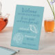 Ecran moderne mais élégant en polystyrène avec turquoise bleu couleur 'Bienvenue - dans notre maison de plage - soyez nos invités et profitez du wifi gratuit - réseau : - mot de passe : - profitez de votre séjour' texte sur un arrière - plan blanc chic. Pour personnaliser ou customiser avec votre propre texte. Une façon simple et amicale de faire savoir à vos clients de location de vacances d'été comment se connecter et utiliser Internet.