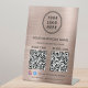 Rose tout usage moderne et professionnel marque de table en or faux métallique pour votre entreprise. Téléchargez votre logo et deux codes QR pour les clients afin de rechercher le paiement, l'information, une liste de produits, services, prix, etc. Ajoutez votre nom d'entreprise, votre numéro de téléphone, votre adresse municipale, votre site Web ou d'autres informations dans une simple typographie. Ajoutez également votre identifiant facebook et instagram pour que les clients puissent vous suivre en ligne.