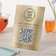 Panneau de piédestal de table en or brossé moderne pour votre entreprise. Entrez l'adresse URL de votre site Web pour créer un code QR numérisable que les clients peuvent rechercher dans la liste de vos produits, services et prix. Ajoutez votre logo, votre nom commercial, votre numéro de téléphone et votre adresse de rue dans une simple typographie.