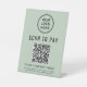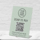 Panneau de piédestal de table moderne vert sauge pour votre entreprise avec un code QR que les clients peuvent scanner pour effectuer des paiements, vous permettant de recevoir des paiements à tout moment, n'importe où. Téléchargez votre logo et ajoutez le nom de votre entreprise, votre numéro de téléphone et votre adresse ou d'autres informations dans une typographie simple. Entrez l'adresse de votre site Web de paiement pour créer automatiquement un code QR scannable.
