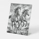 This striking black and white artwork captures two powerful horses galloping side by side in a dynamic display of strength and freedom. Rendered in an expressive pencil sketch style, the piece features bold linework, dramatic shading, and energetic motion strokes that bring the scene to life. The flowing manes and muscular forms convey movement and vitality, making it a captivating focal point. Perfect for equestrian lovers and rustic décor themes, this tabletop art adds elegance, motion, and timeless beauty to any space.