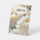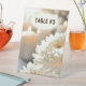 Un gros plan de fleurs blanches de chrysanthème est exposé au premier plan, avec des bougies doucement brillantes floues dans l'arrière - plan, créant une ambiance chaleureuse et sereine. Le numéro de table peut être modifié.
