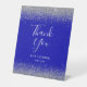 Une enseigne chic et élégante pour accueillir les clients mariages à votre table de favoris. Les mots "Merci" apparaissent en calligraphie d'écriture blanche sur un arrière - plan bleu royal, avec le reste du message dans la police serif.