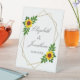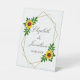 Le design présente des tournesols et des feuilles botaniques sur un cadre géométrique imprimé couleur or.