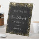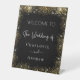 Un arrière - plan noir, décoré de parties scintillant faux or brille. Avec le texte : Bienvenue au Mariage de. Personnalisez et ajoutez vos noms.
