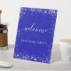 Un signe de bienvenue pour une fête. Un arrière - plan bleu royal. Décoré avec de la parties scintillant en faux argent. Personnalisez et ajoutez votre nom. Texte blanc.