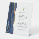 Le bord gauche de cet élégant panneau d'accueil est orné d'une bordure en aquarelle bleu marine ornée d'une parties scintillant en faux or. Une fausse croix de feuille d'or apparaît au-dessus du texte personnalisable, qui combine l'écriture manuscrite, les polices cuivre et italique en gris fusain sur un arrière - plan blanc. Personnalisez-le avec le nom de l'invité d'honneur et la date. Idéal pour la première communion d'un garçon.