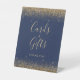 Un panneau chic et élégant pour diriger les clients mariages vers votre table de cartes et cadeaux. L'expression "Card & Gifts" apparaît dans la calligraphie de l'écriture manuscrite de couleur or, avec les mots "merci" ci-dessous en caractères serif sur un arrière - plan bleu marine. Des bordures de parties scintillant en faux or ornent les bords supérieur et inférieur du panneau.
