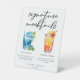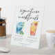 Ce panneau de signalisation de piédestal de mocktails signature de fête au bord de la piscine ou de mariage sur la plage comporte un script simple au-dessus de 2 dessins de boissons et de leurs ingrédients pour votre célébration d'île tropicale. Un joli Blue Lagoon et Summer Sunrise sans alcool pour une réception rafraîchissante au bord de la piscine ou de l'océan en été. Complet avec les noms des couples et la date.