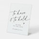 This modern standing wedding sign features the same handwritten “to have and to hold” design with a simple black and white layout and an elegant heart. It’s a minimalist way to guide guests toward your favors, whether you’re offering blankets, slippers, can coolers, hair ties, or any other thoughtful detail. The clean, modern typography and understated style blend beautifully with any décor, creating a classic and elegant focal point for your favor table.