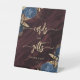 A chic, elegant sign to welcome wedding guests to your Cards and Gifts table. The words "cards" and "gifts" appear in gold-colored handwriting calligraphy with swashes at the beginning and end, with words "thank you!" below in serif font. The background features navy blue floral bouquets set off with gold faux foil foliage in two corners, on a background image of rich burgundy watercolor agate. See our collection for matching wedding invitation suite and day-of stationery.