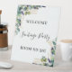 Un fond blanc chic. Décoré de feuilles d'eucalyptus à l'aquarelle verte, de verdure, de feuilles dorées fausses et de fleurs de lavande. Personnalisez et ajoutez un nom et un numéro de chambre.