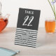 Numéros de table en plastique avec un cheval de course à paillettes argentées sur des rayures noires et blanches en bas et une zone noire solide en bas pour votre personnalisation. ***REMARQUE : MODIFIEZ LE NUMÉRO DE TABLE, mettez dans votre panier pour chaque numéro que vous souhaitez commander. ARTICLES CORRESPONDANTS dans notre collection.