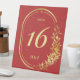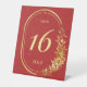 Un élégant cadre doré rouge mariage numéro de table signe de piédestal avec un cadre feuille or classique.