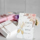 Pour une douche de mariée. Un fond blanc, des fleurs roses et de l'herbe de pampas. Des bulles et une paire de flûtes. Texte : Cartes et cadeaux. Merci !