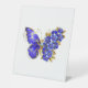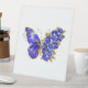 Bijoux, bleu, saphir, papillon aux fleurs pétillantes avec aile décorée de bleu, fleurs précieuses avec feuilles d'or sur arrière - plan blanc.