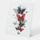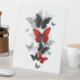 Un troupeau de papillons de morpho volants, réalistes, rouges et noirs sur un arrière - plan blanc avec des gouttes de peinture.