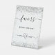 Un élégant arrière - plan blanc, décoré de parties scintillant faux argentées brille. Avec le texte : Faveurs. Prenez-en un, s'il vous plaît. M. et Mme avec un coeur