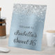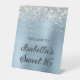 Créez votre propre guéridon de fête du 16e anniversaire pour votre ami. Changez la couleur de police blanche en blanc ou en bleu foncé si vous le souhaitez. L'arrière - plan dispose d'une parties scintillant en argent brillant avec un art numérique en fausse feuille bleu pâle poussiéreux. Tous les éclats, parties scintillant et brillants sont créés avec des éléments numériques qui s'impriment comme une photo.