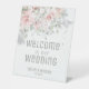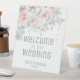 Un bouquet floral d'aquarelle moderne et élégant, rose vif et argenté, avec son ombre qui s'infiltre doucement sur cette enseigne Bienvenue à notre tablette Mariage avec des éclaboussures et des éléments argentés brillants, avec vos prénoms et votre date sous une police moderne.