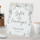 Pivoines blanches peintes à l'aquarelle et vignes de verdure d'eucalyptus argenté avec un texte gris avec vos noms et date de mariage indiquant à vos invités où placer leurs cadeaux et enveloppes