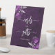 An elegant sign to welcome wedding guests to your Cards and Gifts table. The words "cards" and "gifts" appear in silver gray handwriting calligraphy with swashes at the beginning and end, with the words "thank you!" below in serif font. A pair of purple floral bouquets set off with silver faux foil foliage appear in two corners, on a background image of deep plum purple watercolor agate. See our collection for matching wedding invitation suite and day-of stationery.