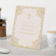 Une fille rose et or première communion signe de bienvenue. Il a un cadre vintage et orné de faux feuille d'or de branches complexes avec des feuilles. Au-dessus du texte, il y a une croix, également de fausse feuille d'or. L'arrière - plan est rose vif, tout le texte est doré et peut être changé.