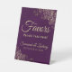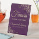 Ce joli panneau de table est conçu pour invitation vos invités à prendre une faveur de mariage. Il présente une conception simple mais élégante de prune violet et d'or avec des lettres de script fantaisie et des boucles et tourbillons délicats en or dans les coins. Le panneau dit : Faveurs, prenez-en une ! Il y a de la place pour vos noms et la date du mariage ci-dessous.