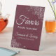 Ce joli panneau de table est conçu pour invitation vos invités à prendre une faveur de mariage. Il présente un design bordeaux et argenté simple mais élégant, avec des lettres de script fantaisistes et des boucles et tourbillons délicats dans les coins. Le panneau dit : Faveurs, prenez-en une ! Il y a de la place pour vos noms et la date du mariage ci-dessous.