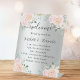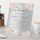 Un programme d'accueil, une affiche chronologique pour un mariage. Un arrière - plan élégant à l'allure fausse argent décoré de fleurs blanches et roses rousses. Personnalisez et ajoutez vos noms et les détails. Lettres noires.