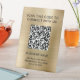 Signe de tablette promotionnelle simple et moderne pour votre entreprise ou organisation avec un faux arrière - plan métallique en or brossé. Ajoutez votre code QR et deux lignes de texte personnalisé, comme "scanner pour se connecter avec nous" et le nom, l'adresse et le numéro de téléphone de votre société.