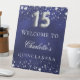 Un signe de bienvenue pour une Quinceañera, fête du 15e anniversaire. Un arrière - plan bleu marine avec d'élégantes étoiles faux argent. La couleur bleue est inégale. Personnalisez et ajoutez un nom et un texte. Lettres blanches.