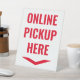 Il s'agit d'un panneau de piédestal blanc "Online Pickup Here" avec une flèche vers le bas et un texte en rouge. Il sert à indiquer où les clients peuvent prendre leurs commandes en ligne. Message clair et facile à repérer. Un grand panneau de commande pour les restaurants, les magasins et autres petites entreprises.