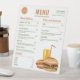 Carte des prix de menu pour un restaurant ou un vendeur de street food illustrant l'illustration de Destei d'une restauration rapide, dont une boisson orange avec une paille rouge, un hot dog avec ketchup et moutarde sur le dessus et un hamburger avec un pain de sésame rempli de fromage, laitue, boeuf, tomate, ketchup et pickles. Il y a plusieurs zones de texte personnalisables pour lister différents types de repas et d'autres options de menu. En haut, il y a même un endroit pour un logo personnalisé. Personnalisez ce design pour répondre aux besoins de votre entreprise.