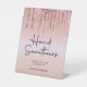 Un panneau de nettoyage à la main pour votre mariage avec des gouttes de parties scintillant en or rose et un script élégant écrit à la main en noir pour l'en-tête. Le reste du texte peut être facilement personnalisé à vos mots.