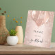 Rose gold, fond rose saumon. Décoré de fausses gouttes de paillettes, d'étincelles et de ballons. Avec le texte : Veuillez signer le livre d'or.