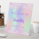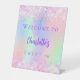 Un signe de bienvenue ou un Sweet girly et glamour 16. Un arrière - plan holographique tendance en rose, violet, vert menthe. Décoré de confettis roses. Personnalisez et ajoutez un nom. Texte mauve. Retour : aucune conception