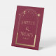 Celestial Red Gold Anniversaire Sun Moon Stars Astronomy Space Party Événement Piédestal Signet Tabletop Signé offre soleil doré, lune et étoiles avec un cadre doré sur un arrière - plan rouge. À l'intérieur, il y a votre texte personnalisé. Conçu pour vous par Evco Studio www.zazzle.com/store/evcostudio