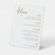 Affichez vos sélections de menu mariage ou événementiel dans un style moderne avec cette enseigne sobre et élégante sur socle avec lettrage en terre cuite rouille sur un arrière - plan blanc immaculé. "Menu" ou votre en-tête personnalisé apparaît en haut dans les lettres manuscrites modernes. Personnalisez avec les éléments de menu ci-dessous, alignés à droite.