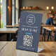 Simple modern blue table top pedestal sign with your Venmo QR code for customers to scan for payments. Upload your logo and QR code and add your business name, phone number and street address or other text in simple white lettering.