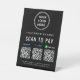 Simple panneau de piédestal de table noir pour votre entreprise avec les codes QR de Venmo, Paypal et CashApp pour que les clients scannent pour les paiements. Ajoutez votre logo, vos codes QR, le nom de votre entreprise, votre numéro de téléphone et votre adresse rue dans une typographie blanche simple.