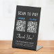Simple panneau de piédestal noir de table moderne pour votre entreprise avec les codes QR Venmo et Paypal pour que les clients scannent pour les paiements. Ajoutez vos codes QR, nom de l'entreprise, numéro de téléphone et adresse rue dans une typographie blanche simple.