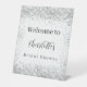 Un panneau de bienvenue pour une fête de mariage. Un fond blanc élégant décoré de confettis argentés factices. Personnalisez et ajoutez un nom. Lettres noires.