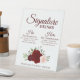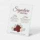 Ce panneau de table est parfait pour le bar à votre réception de mariage. Il présente un design simple mais élégant avec un ensemble de roses d'aquarelle peints à la main dans les tons bordeaux, rouge et rose roux. Le panneau indique : Signature Drinks, et il y a de l'espace pour son préféré et son préféré.