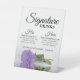 Ce panneau de table est parfait pour le bar à votre réception de mariage. Il présente un design simple mais élégant avec une photo d'un seul rose à long tige violet clair ou lavande réfléchissant dans un bassin d'eau avec des vagues et des ondulations. Le panneau indique : Signature Drinks, et il y a de l'espace pour son préféré et son préféré.