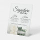 Ce panneau de table est parfait pour le bar à votre réception de mariage. Il présente un design simple mais élégant avec une photo d'un seul rose à long tige en ivoire, blanc ou crème réfléchissant dans un bassin d'eau avec vagues et ondulations. Le panneau indique : Signature Drinks, et il y a de l'espace pour son préféré et son préféré.