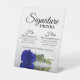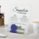 Ce panneau de table est parfait pour le bar à votre réception de mariage. Il présente un design simple mais élégant avec une photo d'un seul rose bleu royal vif à longue tige ou couleur cobalt se reflétant dans un bassin d'eau avec vagues et ondulations. Le panneau indique : Signature Drinks, et il y a de l'espace pour son préféré et son préféré.