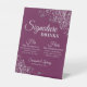 Ce panneau de table est parfait pour le bar à votre réception de mariage. Il présente un design simple mais élégant avec des lettres de script sur un magenta, cassis violet, ou arrière - plan couleur baies, et délicats boucles et tourbillons gris argent dans les coins. Le panneau indique : Signature Drinks, et il y a de l'espace pour sa préférée et ses favoris avec les noms du couple, la date mariage, et les recettes de cocktails.