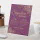 Ce panneau de table est parfait pour le bar à votre réception de mariage. Il présente un design simple mais élégant avec du texte doré sur un magenta, un arrière - plan mauve de cassis ou rouge prune, et des boucles et tourbillons floraux délicats dans les coins. Le panneau indique : Signature Drinks, et il y a de l'espace pour sa préférée et ses favoris avec les noms du couple, la date mariage, et les recettes de cocktails.